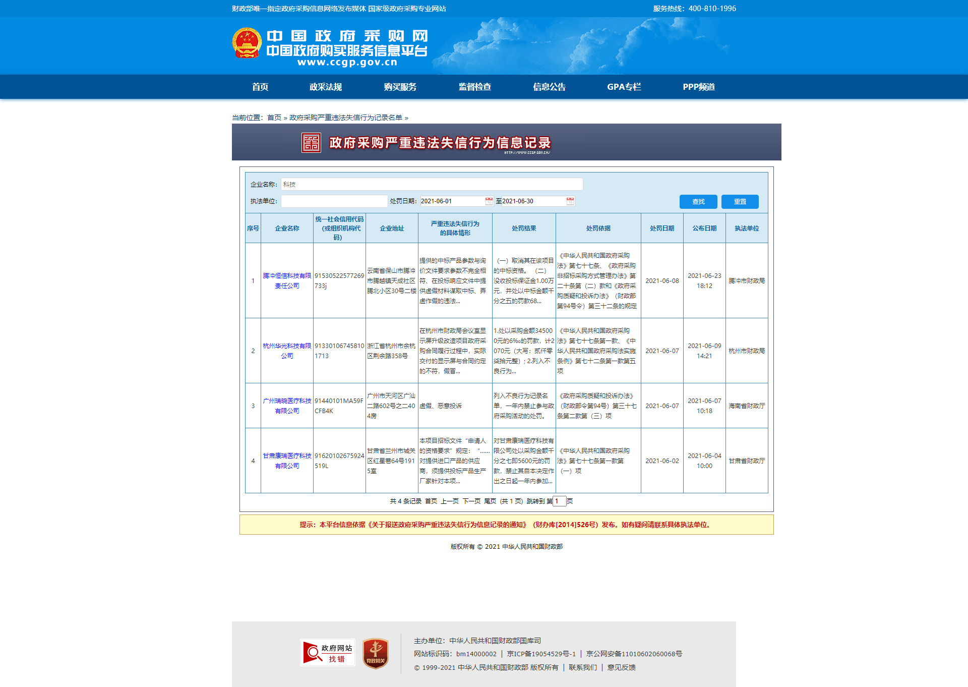 2021-06-28 13:03:18随着政府采购规模逐渐扩大,一些不法供应商为了牟取不正当的利益,想尽各种方法混入政府采购市场。其中,提供虚假材料谋取中标是政府采购领域最常见的违法行为。记者查询政府采购严重违法失信行为记录发现,6月科技企业中,共有四家供应商在参与政府采购活动时出现严重违法失信行为,其中就有两家是因提供虚假材料而被处罚。6月23日,腾冲恒信科技有限责任公司的处罚公告发布后,《政府采购信息》报记者电话联系了腾冲市财政局向工作人员了解事情的来龙去脉。