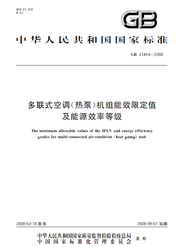 2022-04-12 10:09:01本国家标准为《多联式空调(热泵)机组能效限定值及能源效率等级》,该标准发布单位为中华人民共和国国家质量监督检验检疫总局、中国国家标准化管理委员会。标准号为GB 21454-2008,发布日期2008年2月18日,实施日期2008年9月1日。该标准为国家强制性标准,以下为标准原文: