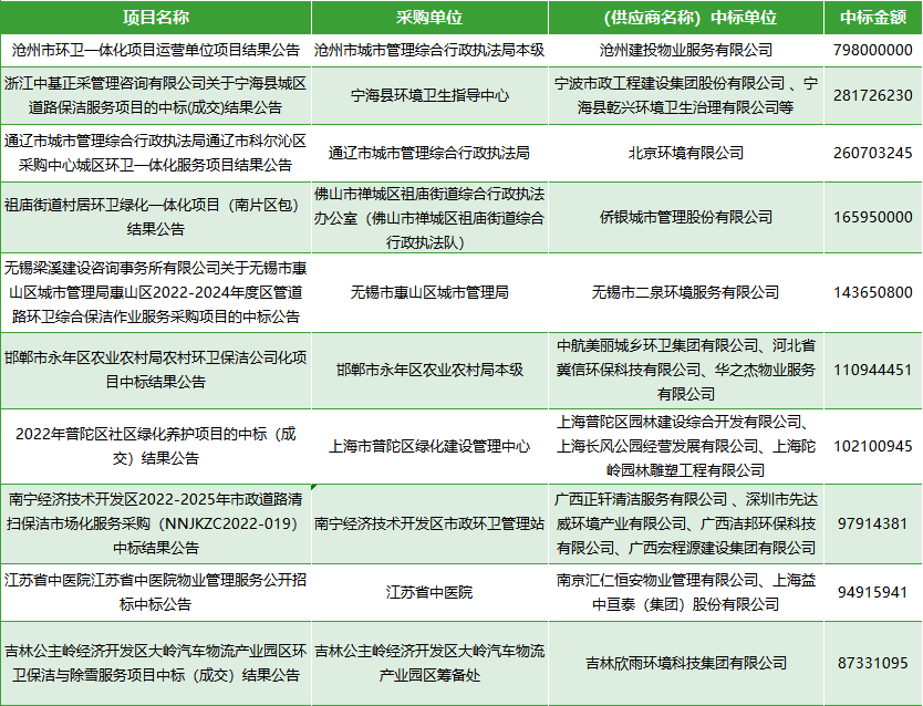 7月物业服务政府采购排名前十的大标具体中标信息请看由小编整理的表格: