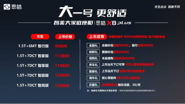思皓X8 PLUS共5款车型,官方指导价9.98万元-13.98万元,并尊享多重大礼:订车可享受至高8000元金融补贴、至高8000元增换购补贴、核心零部件5年或20万公里质保、3年免费娱乐流量(3G/月)、上市当天下订可享10万公里免费基础保养和至高万倍膨胀金等,诚意十足。