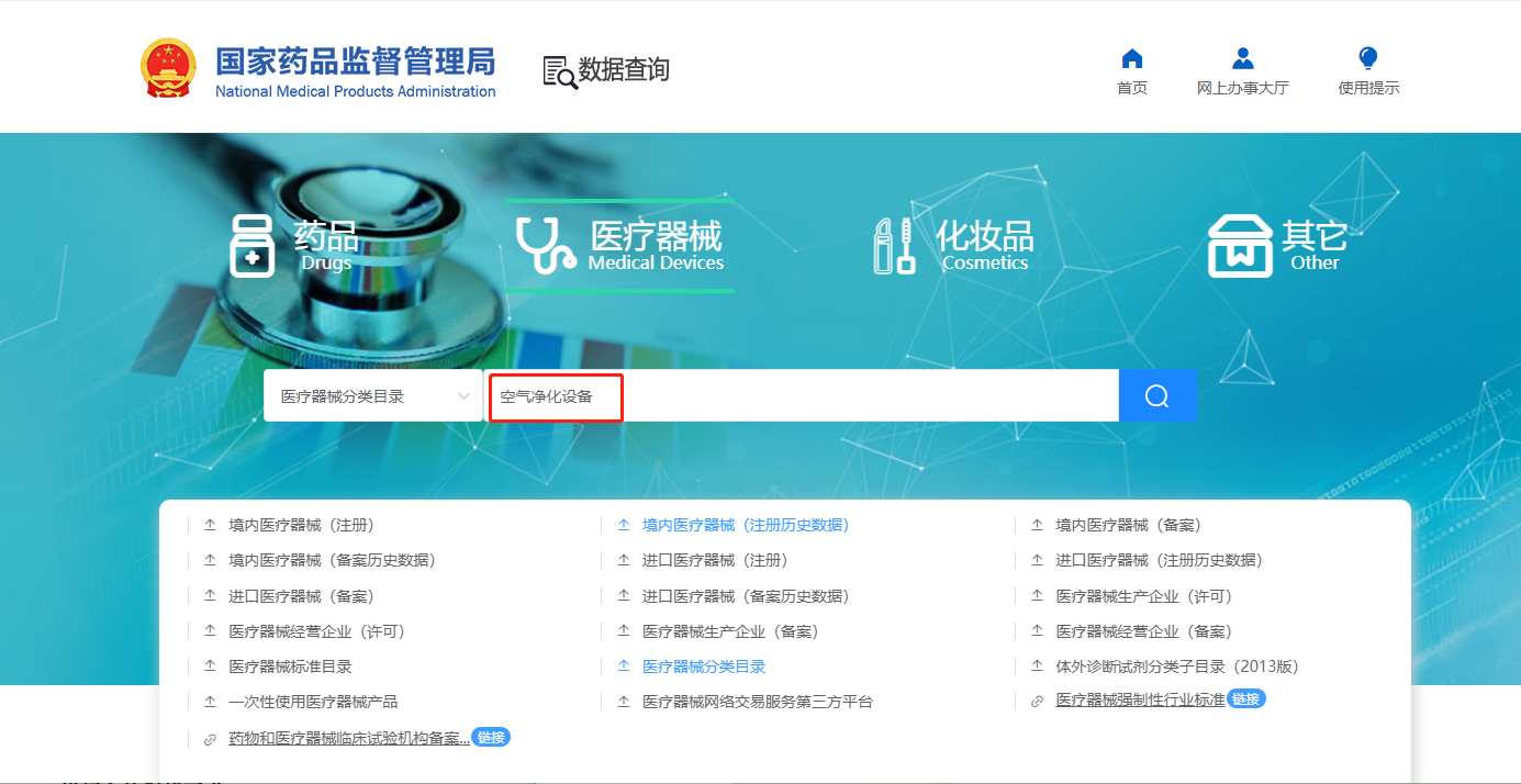 政府采购信息报记者根据2017年国家食品药品监督管理总局(现为国家市场监督管理总局)发布的《关于发布医疗器械分类目录的公告(2017年第104号)》附件中的医疗器械分类目录发现,空气净化设备并不在其内。
