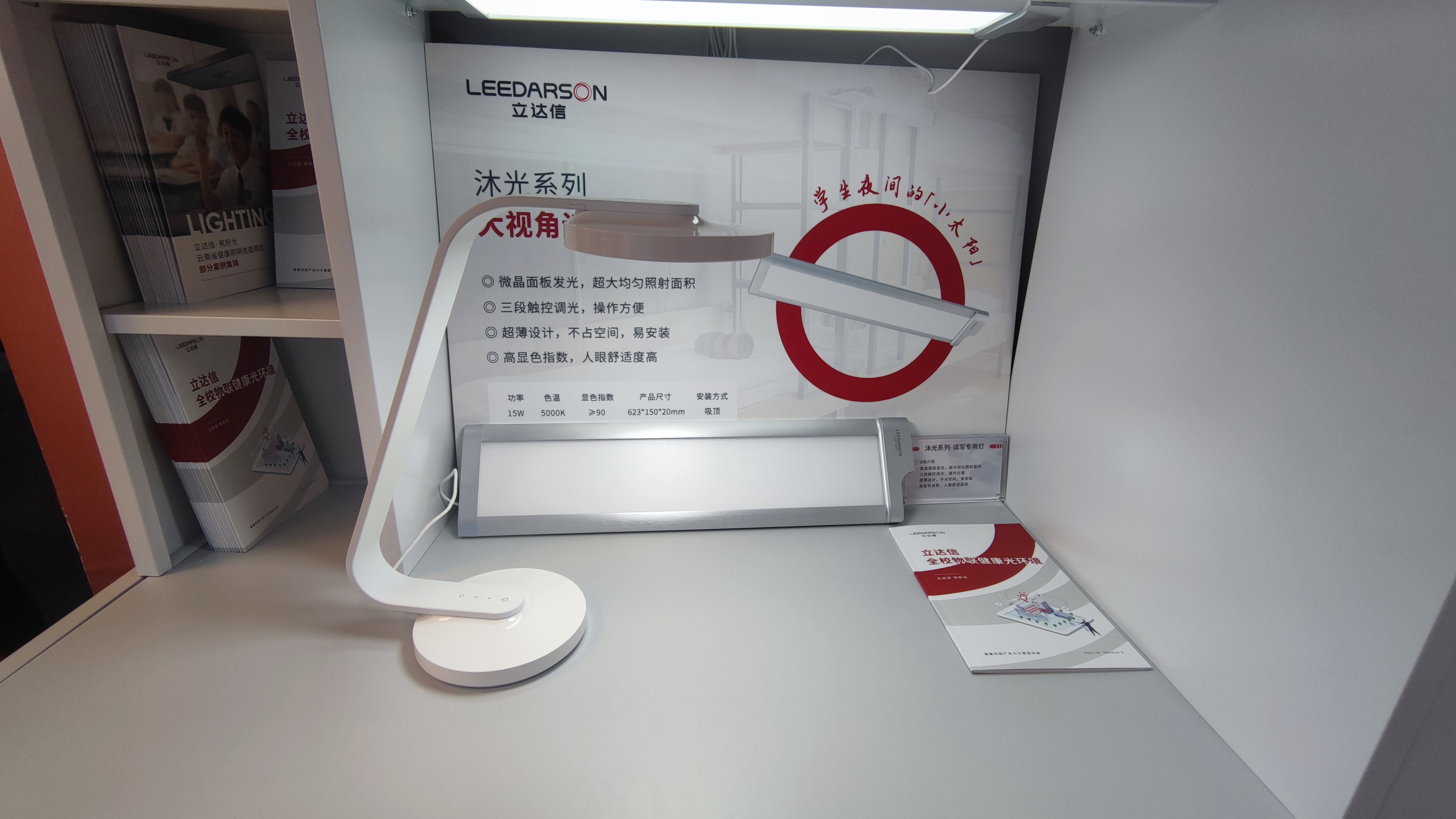 记者观察到,厦门立达信光电有限公司(以下简称立达信)展出了广角立体空间灯、读写专用灯和沐光台灯等宿舍灯具。“我们的广角立体空间灯功率为38W,色温为5000k,显色指数≥ 95,安装方式是吸顶安装。”立达信产品总监马永墩向记者介绍:“宿舍灯具均采用双波芯片设计降低蓝光峰值,具有护眼功能。许多学生会在宿舍看书学习,所以采购人比较看重宿舍照明灯具的护眼功能。”江苏宜美照明科技股份有限公司区域经理戴小平进一步补充道:“宿舍灯具大部分都具有护眼功能,宿舍照明灯具与普通教室照明灯具的主要区别是灯具形状不同,宿舍照明灯具主要以吸顶的圆形灯具为主,而教室照明灯具主要是长条状的。”